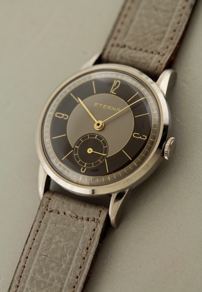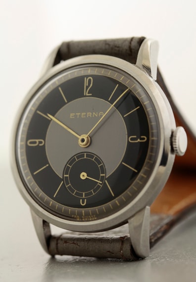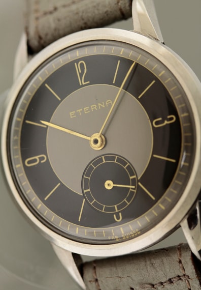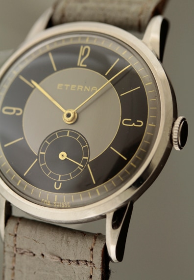 自動巻きモデルやクロノグラフからシンプルなモデルまで、愛好家が好むデザイン性の高い作品が多いエテルナ。今回入荷した固体もまさに通好みの一本と言えそうです。ケースサイズは30ミリと小振りですが、光沢感のあるツートンダイヤルに12、3 、9というデコデザインが、サイズ以上の存在感を放つ一本です。しかもこれまであまり使用された形跡のない素晴らしいコンディション。