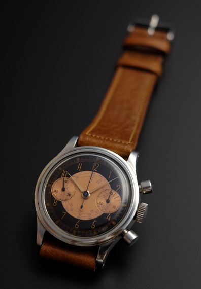 線の細いインデックスに鋭い長短針の組み合わせも良く、無銘ながら素晴らしい雰囲気、テイストのクロノグラフだと思います。