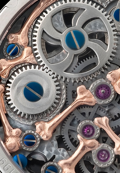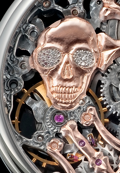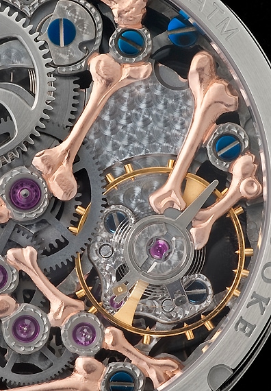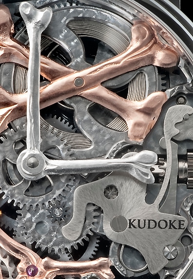「スカル」や「骨」が精巧なエングレービングにより表現され、時計師であり彫金師でもあるステファン・クドケだからこそ表現できた大人にふさわしいスカルモデルに仕上げています。