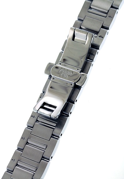中折れ式観音開きクラスプ、割ピンによる駒調節で長さ変更可(弊社、もしくはお近くの時計店で調整下さい)