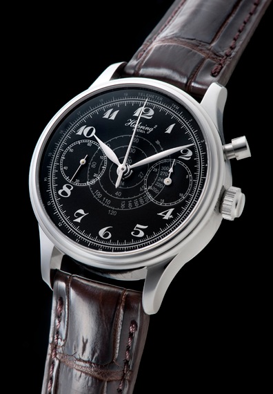 マットのブラックダイヤルに映えるブレゲ数字のインデックス、そして渦巻き状のタキメーター表示、そして肉厚で鋭いリーフ針は、1930~40年代のヴィンテージクロノグラフを彷彿とさせるデザインです。