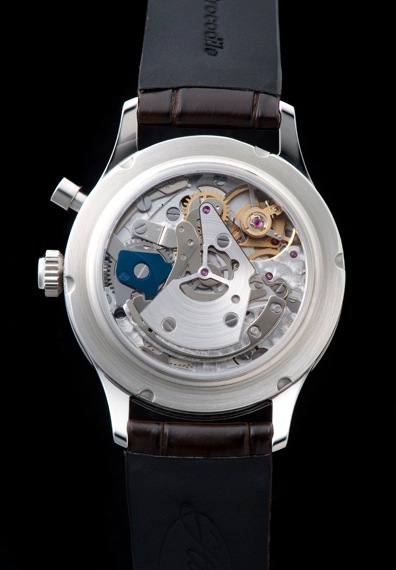 内包するのはETA7750をベースに独自の改良を加えたCal.A08-MONO。クロノメーター級のクオリティを備えた脱進機とトリオビス緩急調整装置を搭載した高級仕様ムーブメントです。