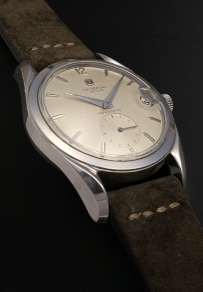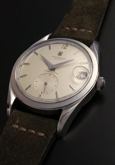 どちらかと言うとアンティーク市場ではクロノグラフに人気の集中するユニバーサルですが、今回ご紹介するのはシンプルなデイト表示付きのMONODATIC。 偶数が黒で奇数が赤という異色のカレンダー表示と後年のトリコンパックスを思わせる幅広ベゼルとツイストラグが魅力の一本です。