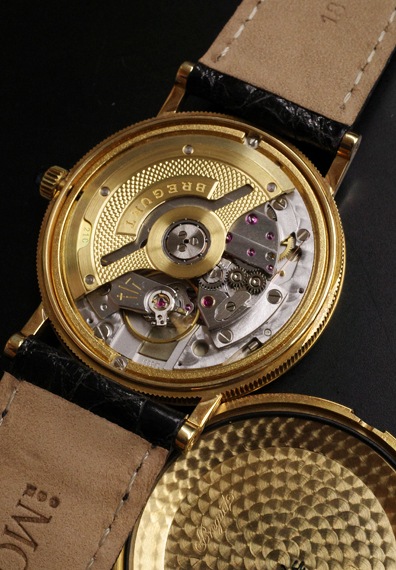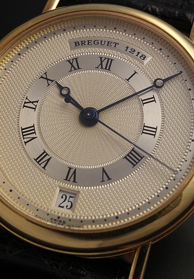 インデックスの内側、外側でパターンを変える手動旋盤による手彫りのギヨシェ文字盤、ブレゲ・ポム・ハンドと呼ばれる代名詞ともいえる針、ケースサイドのコインエッジ…随所に控えめながら洗練されたブレゲスタイルが凝縮しています。