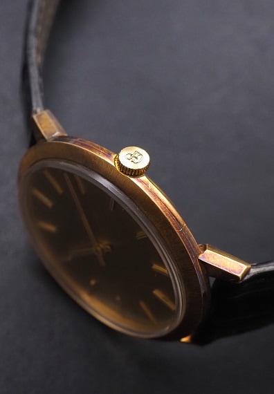 18KYGのソリッドなゴールドケースに、同色のダイヤルと秒針のついていないシンプルな2針の構成となっています。端正なスタイルではありますが、同ブランドならではの拘りあるディテールを随所に見てとれます。