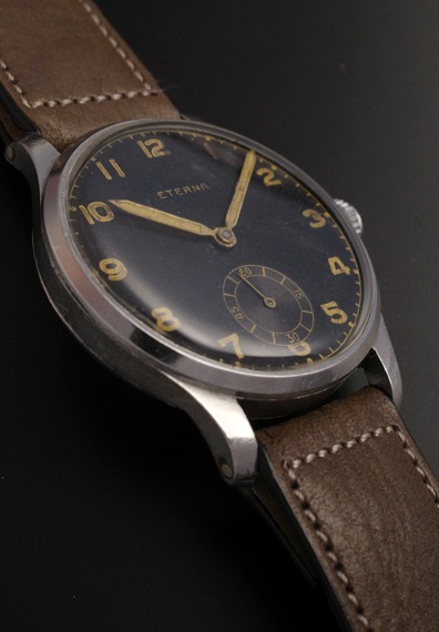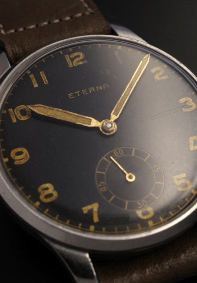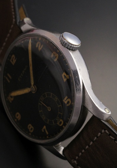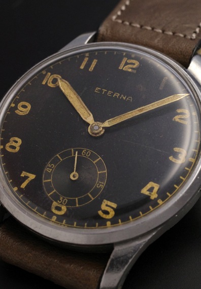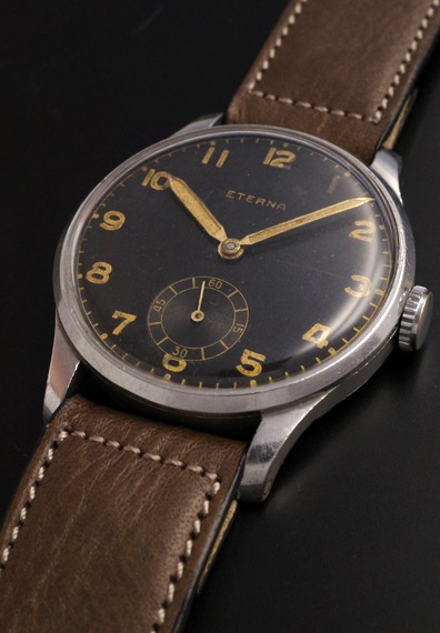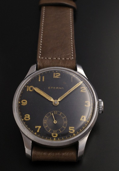 1940年代製のエテルナの手巻きモデルが入荷しました。マットな質感のブラックダイヤルと夜光インデックス&夜光針というミリタリーライクなテイストの一本となります。各パーツのヴィンテージらしい枯れ感、エイジングもそうしたテイストを一層引き立てており、状態も良好です。