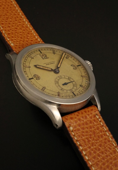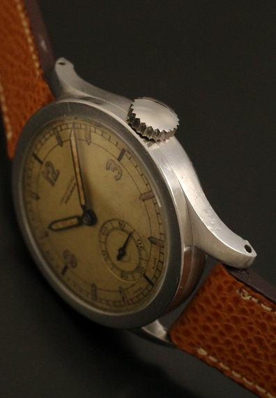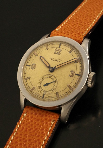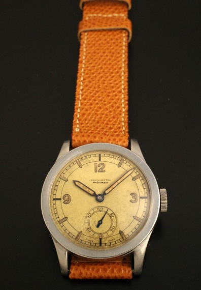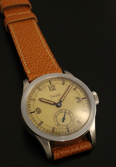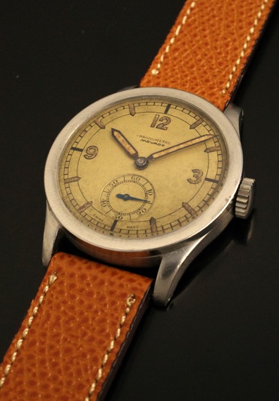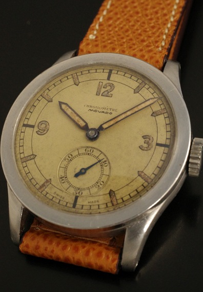 1930年代製のモバードの“CHRONOMETRE”(クロノメーター)表記の手巻きモデルが入荷しました。幅広のフラットベゼルが際立つカラトラバスタイルのケースに12、3、9飛び数字のセクター系デザインのダイヤルが組み合わされた通好みの一本となります。