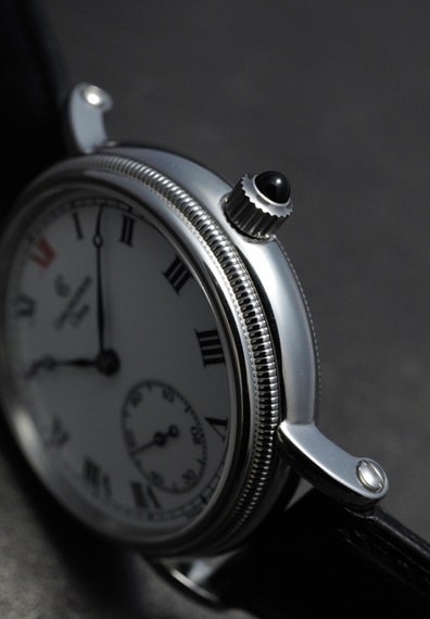 特徴は、やはり文字盤にエナメルを使用している点でしょう。銅のプレートをベースに4層に渡りエナメル層を重ねるという古典的手法で造られるエナメル文字盤は、ヴィンテージウォッチの時代のエナメル文字盤と遜色ない質感を持ち合わせます。勿論クラックは無く、ペイントによるローマンインデックスにブレゲ針と懐中時計をも思わせる古典的なダイヤルデザインにも相性は抜群です。また、ケースも時計全体の雰囲気に合わせ、サイドのコインエッジやカボションリューズとダイヤルと同様にアンティークウォッチを彷彿とさせるクラシカルな佇まいです。