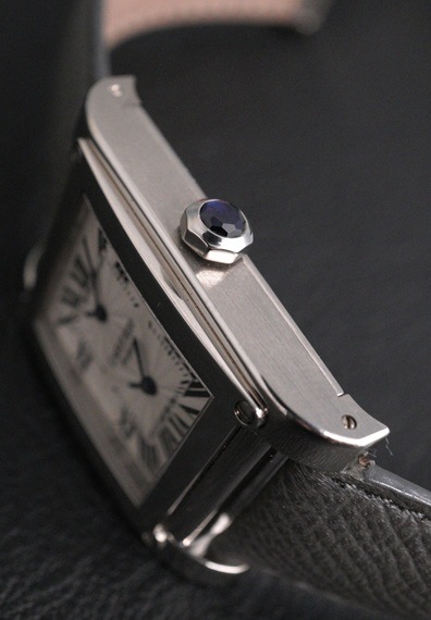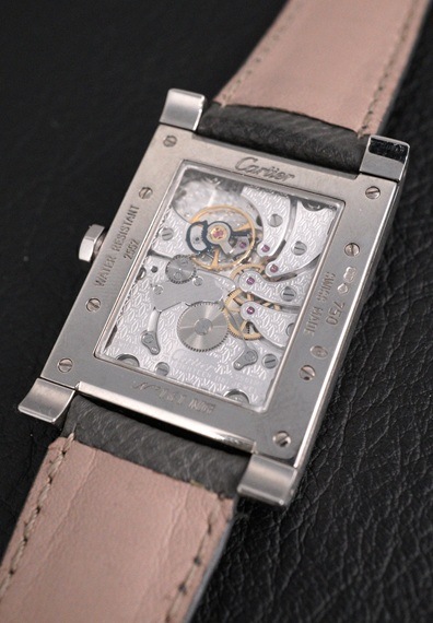今回入荷の個体は、ベゼルにビスを用いた意匠が特徴的な「タンク・ア ビス」です。ダイヤルは2タイムゾーンとなっており、一つのリューズで上下でホームタイムとローカルタイムを設定することが可能です。美しいギョーシェ彫りのダイヤルは、大きな経年変化等は無く、上下での仕上げの違いよるダイヤル中央の線もハッキリと見て取れます。また、ケースも使用による若干の小傷を除けば、ポリッシュ感のないシャープなフォルムをしっかりとキープしています。他にもラグ先端の鋭いエッジや、サイドのヘアラインもしっかりと残っていて抜群のコンディションです。ムーブメントは自社製ムーブCal.9901MCを搭載。シースルーバック仕様となっており、全面に施されたカルティエマーク存在感があります。