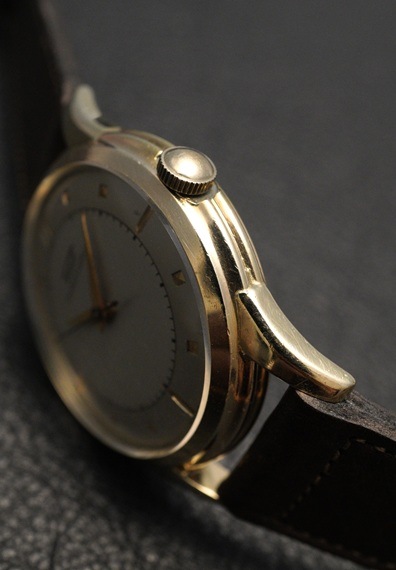 掘り込みによる立体的なピラミッド型&砲弾型のインデックスの組み合わせに、その内側を取り巻くミニッツマーカー、ツートンダイヤルという通好みのスタイルでデザイン性の高い一本です。柔らかい色味の金張りのケースに、これらの組み合わせがど相まって、ドレッシーな印象ながらもどこか愛嬌の感じられる佇まいとなっています。全体のコンディションは中々で、GFケースならどうしても気になる剝離等も見受けられません。大きな経年変化も無く、幅広いシーンで活躍してくれる一本です。搭載する、ハーフローター仕様のCal.28.5-21もオーバーホール前ながら赤銅色が美しく、良好なコンディションです。ハーフローターならではのローターの跳ね返り感もアンティークならではの楽しみと言えるでしょう。