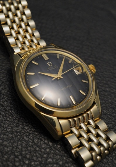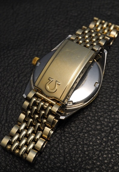 こちらは同じくYGGFの純正ブレスレットも付属します。やや経年によるブレスレットの伸びが見受けられますが、使用には問題ないでしょう。ケース、ブレスレットの柔らかい色味による一体感も魅力です。ヴィンテージオメガを代表するシーマスターのレアモデル。希少なタペストリー仕様のブラックダイヤルは、定番機ながらひと味違う印象です。ぜひこの機会にご検討ください。
