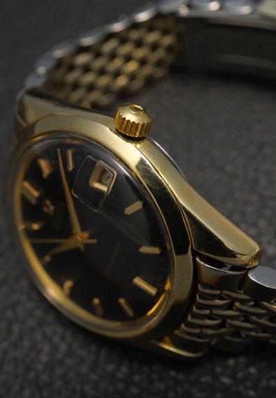「タペストリー」とも呼ばれる縦にストライプの入ったダイヤルで、細やかなカットの入ったインデックスに鋭いアルファ針の組み合わせも秀逸です。希少性が高いデザインではありますが、更にブラック×タペストリーのダイヤルともなると、出会いの機会は極めて稀です。印象的なブラックダイヤルも大きく経年変化はしておらず、艶のある美しい黒色をキープしています。ダイヤルのストライプ状のカット面が角度によって煌めき、実に魅力的な表情を作り出します。金張りのケースも剥がれは無く、ベゼルやラグも製造時のシェイプをしっかりと残した素晴らしい状態です。