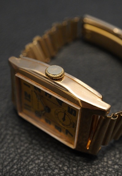ダイヤルを4分割したツートン仕様の「クリスクロス」に程よく枯れた全アラビア数字のインデックスと、この年代ならでは通好みの素晴らしいテイストの一本です。アールデコらしいユニークな形状の長短針もこのダイヤルデザインをさらに引き立てているようです。また、ケースも31(ラグを含むと約40ミリ)✕25ミリという、アンティークにしては比較的大きなサイズ感と多面構造の立体的なシルエットはダイヤルとの相性も良く、通常の角型モデルとは異なる独特の存在感を放っています。