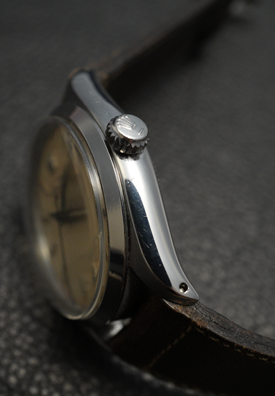 エンボス仕様のクサビインデックスにドルフィンハンドの組み合わせで、この年代らしい凝縮感のあるデザインとなっています。ダイヤルは全体的に枯れ感のあるアイボリーカラーにエイジングしており、ヴィンテージウォッチならではの良い雰囲気です。経年変化に加えて、エンボスによる王冠マーク、立体的で陰影のあるインデックス&針のクラシカルなスタイルは、時計全体の印象をより際立たています。