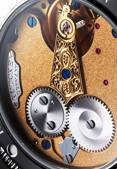 搭載するのは、テンプ受けに施された彫金が印象的な自社ムーブメント、Kaliber 1-24H。一見シンプルに見える梨地仕上げの地板も、細かい石を混ぜたオイルにムーブメントを浸し、絶妙な力加減で指で擦り上げてつくりあげました。