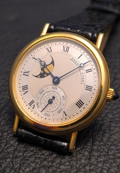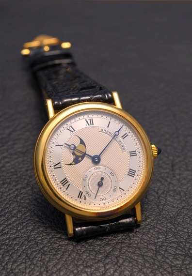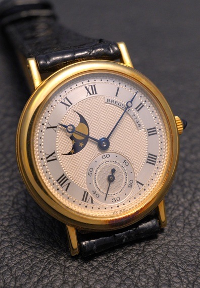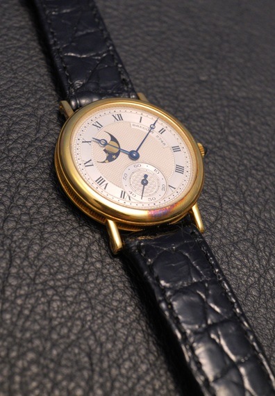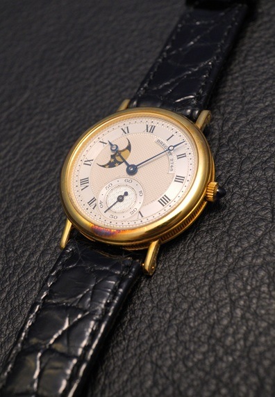 創業者であるアブラアン-ルイ・ブレゲが手掛けた作品群に着想を得て誕生した「クラシック」と呼ばれるコレクションの三針+ムーンフェイズのモデルです。ムーンフェイズの非対称の配置は、18世紀付近に製作されたブレゲの懐中時計の代表的なデザインです。一見すると独創的に見えますが、当時の意匠を大いに感じていただけます。他にも、代名詞の一つでもある手動旋盤による手彫りのギョーシェ彫りを施した文字盤に品格漂う立体的な青焼きのブレゲ針、ケース側面にはコインエッジ..。同ブランドならではのアイコニックなディテールが随所に施されています。