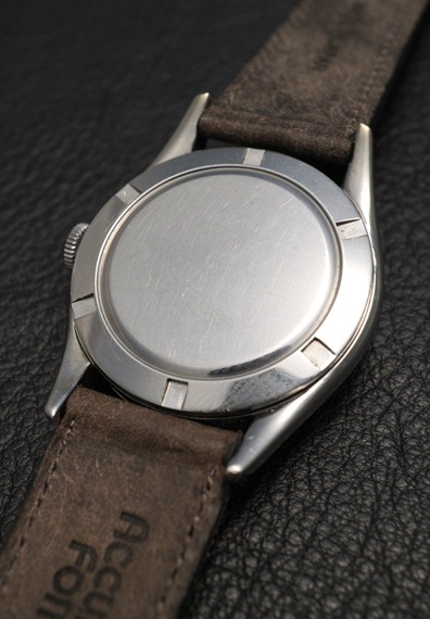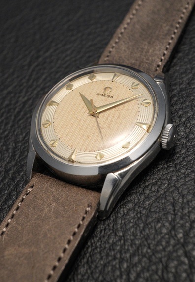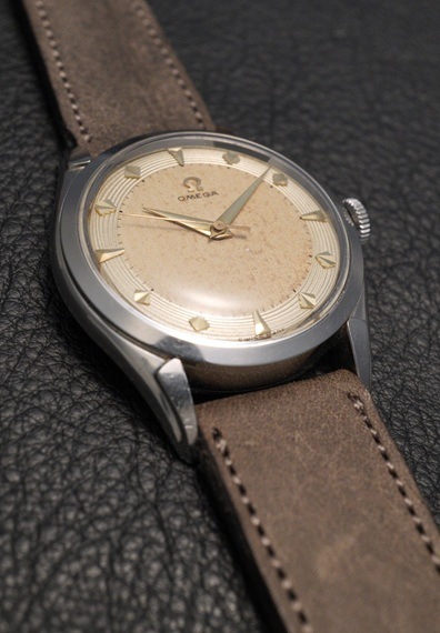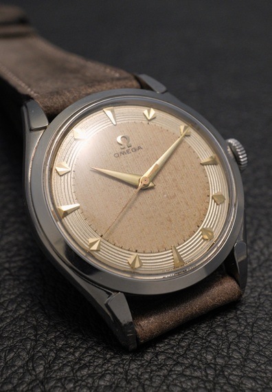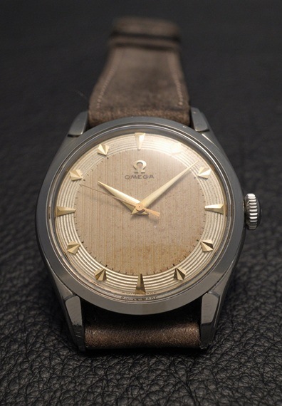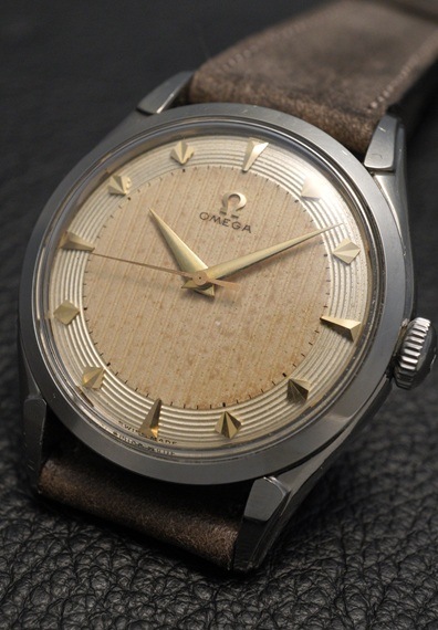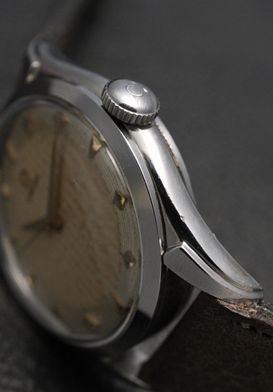 異なるギョーシェとの組み合わせであるツートンダイヤルに、ラグが二重になっているようなステップ仕様の個性的なデザイン。ギョーシェは外周にはサークル状、内周はストライプと異なる仕上げで、ダイヤルの枯れたようなエイジングも相まって、非常に雰囲気のある一本です。鋭いドルフィンハンドと迫力のあるクサビインデックスの組み合わせも秀逸で、ヴィンテージならではの魅力も大いに感じられます。