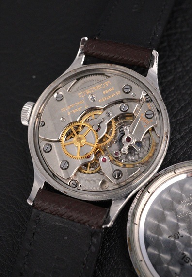 ダイヤルのエイジングについては、実際は画像ほど強い印象はなく、全体のイメージを著しく壊すようなレベルではないと思います。アンティークならではの雰囲気を存分にお楽しみいただけるでしょう。また、ケースに関してはラグやベゼルのシャープなラインをしっかりと残したなかなかのコンディションで、腕に乗せた時の迫力ある佇まいも健在です。搭載するのは、コートドジュネーブも際立つセンターセコンド仕様のCal.450/3。大きな錆やダメージは見受けられません。シンプルなデザインと質実剛健なつくりで、人気の高いジャガー・ルクルトの手巻モデル。24時間表記のデザインも秀逸です。ぜひこの機会にご検討ください。