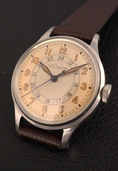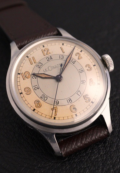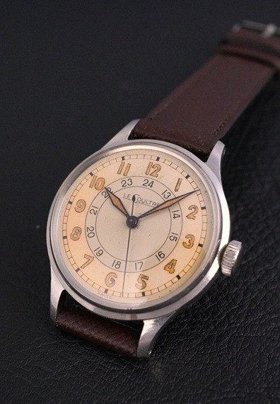 ブランドネームが北米市場向けの"LECOULTRE"表記で、シャープな夜光長短針と内周に沿ってレイアウトされた24時間表記が特徴的な一本です。美しいエイジングのツートンダイヤル&サークルライン、24時間表示となると凝縮感もなかなかのものです。同ブランドで24時間表記が入るモデルですと30㎜前後が多いイメージですが、今回の個体は33㎜とやや大きめに感じられるサイズ感。ただ、ルクルトらしい美しいケースラインやメリハリの効いたダイヤルデザインも相まって、時計全体の均整と独特の存在感がしっかりと両立されています。