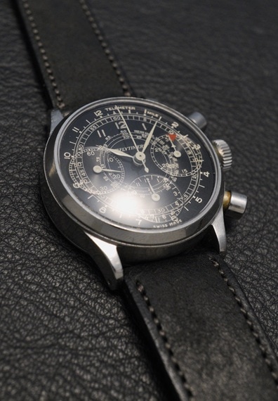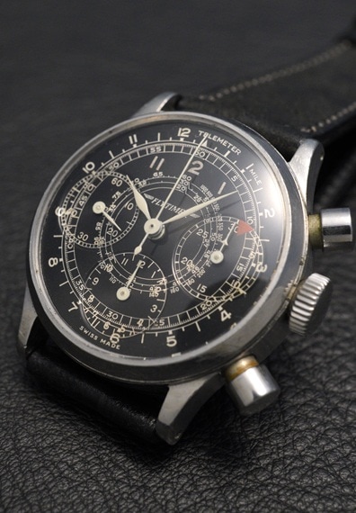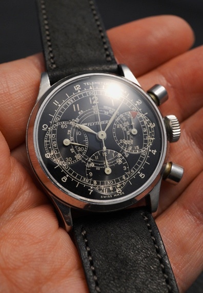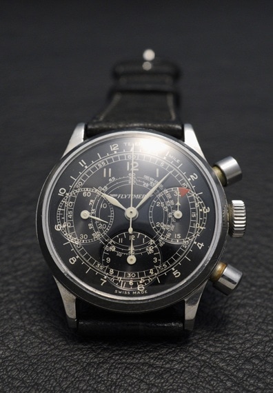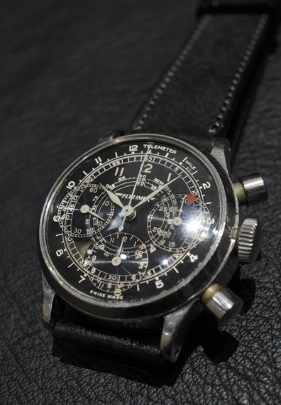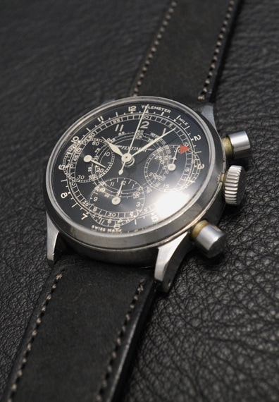 1920年代にティファニーの時計職人であったカール・プレプラ氏が創業した同ブランド。1940年代にはJARDUR社(ジャードゥー社)と共同開発という形で、パイロットウォッチの製造で名を馳せました。今回の「FLYTIMER/フライマスター」も3カウンターにテレタキ仕様とパイロットウォッチならではディテール。人気のブラックダイヤルに加えて各積算計は下地出しとなっており、クロノグラフならではの凝縮感のあるデザインに加えて、陰影のある素晴らしいテイストの一本です。