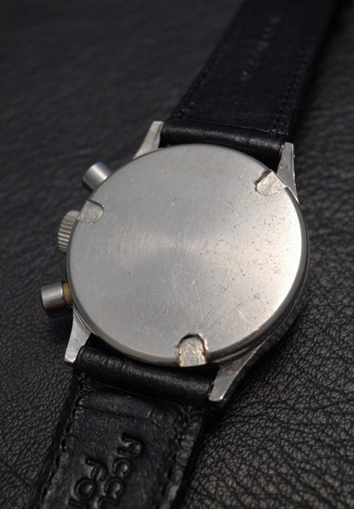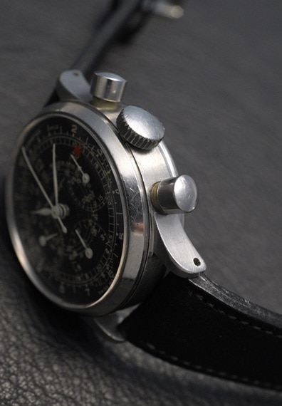 ケース径は33㎜とクロノグラフとしては小ぶりに思えがちですが、厚みのある3つ爪の防水ケースにビックサイズのプッシュボタン、リューズ等からサイズ以上に迫力が感じられます。厚みのある重厚感溢れるケースシルエットは、着用時に独特の存在感を放ってくれます。コンデションとしても、大きな経年変化は無く艶のあるブラックダイヤルや本来のケースシェイプは健在です。ムーブメントは、3カウンター仕様のValjoux72を搭載。こちらも錆やダメージ等は無く、素晴らしいコンディションです。高いオリジナル性と良質なコンディションを併せ持った特別なカール・プレプラ フライタイマー。マイナーメーカーながら、デザイン性の高さや造りの良さも魅力的です。是非この機会にご検討ください。