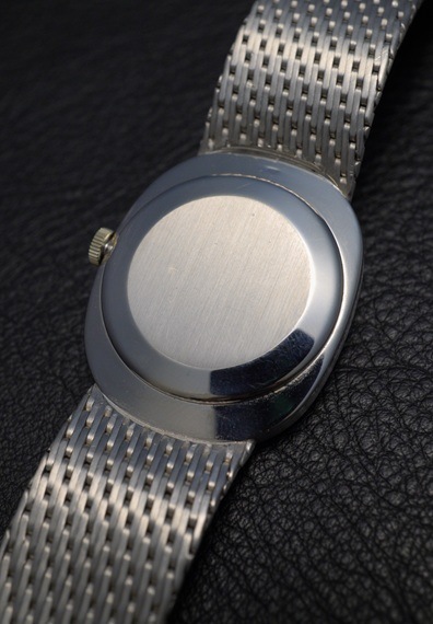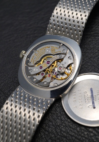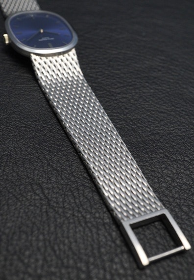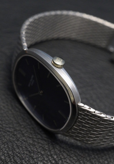 この年代ならではの淡いブルーダイヤルに、フランス語で「楕円」の意を持つ"Ellipse/エリプス"の名に相応しい美しいオーバルケースが特徴的です。今回の個体は18Kホワイトゴールドのブレス一体型ケースですので、ラグジュアリーな雰囲気と上品な印象を併せ持つ一本です。