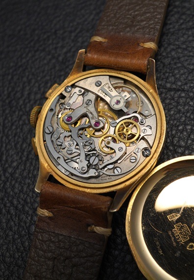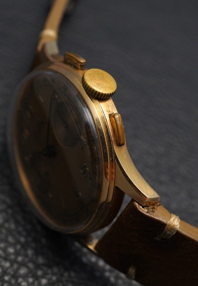 18Kピンクゴールドの独特の色合いのケースに美しくエイジングの進んだカッパー(赤銅)カラーのダイヤルが組み合わせが魅力の一本。デザインはタキメーター&ツーカウンターで、インデックスや長短針等に夜光塗料を使用しないシンプルなスタイルですので、印象的なダイヤルカラーながらも上品さも感じられます。また、ブランドロゴも特徴的な書体でクラシカルな佇まいをより際立たせてくれます。