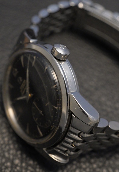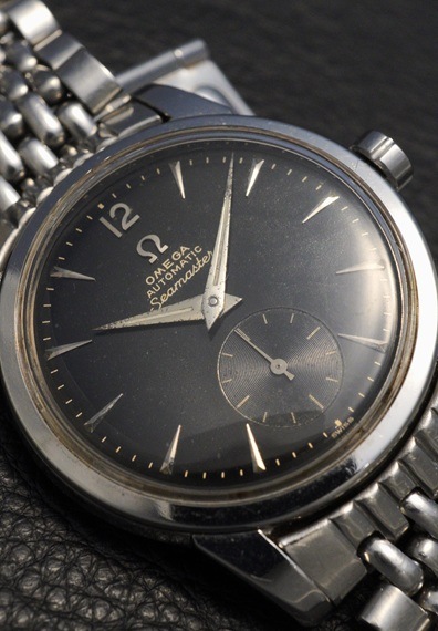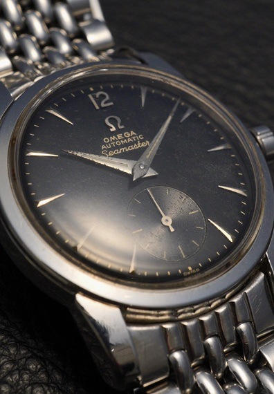 程よい枯れ感のマットなブラックダイヤルに太くがっちりとしたラグ&重厚感溢れる防水スナップバックケースが特徴のシーマスターです。ブラック×シルバーカラーで統一されたシンプルながらしっかりと主張するダイヤルは、均一にエイジングが見られ、ヴィンテージオメガらしい雰囲気のある佇まいです。クラシカルなクサビインデックス&ドルフィンハンドのディテールとも相まって、この時計の魅力を一際際立たせています。