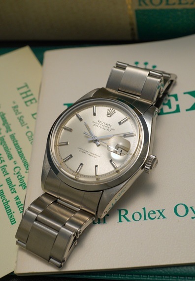 オールステンレスでスムースベゼルを備えたRef.1600 デイトジャスト。同年代のRef.1601やRef.1603に比べると生産数も非常に少なく、希少性が高いモデルです。更に今回の個体は、ギャランティ等のペーパー類や純正箱、同年のリベットブレスレットが付属する、嬉しいフルセット仕様となります。