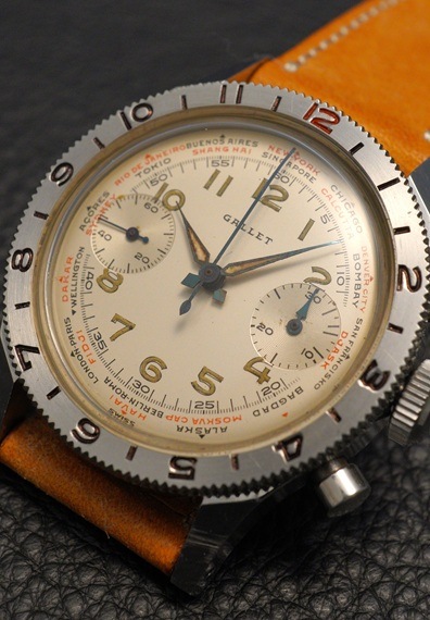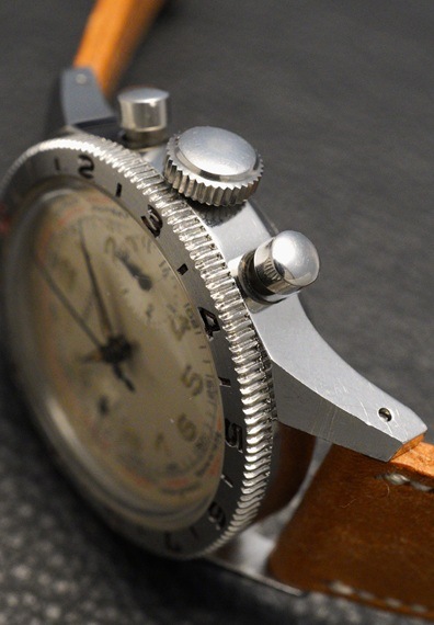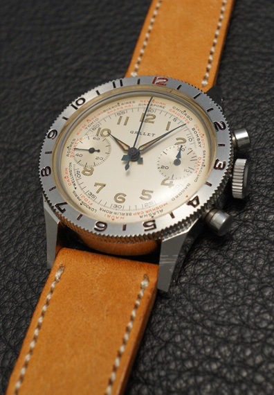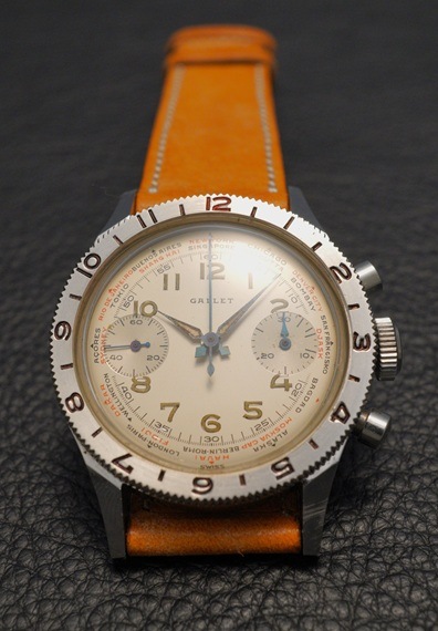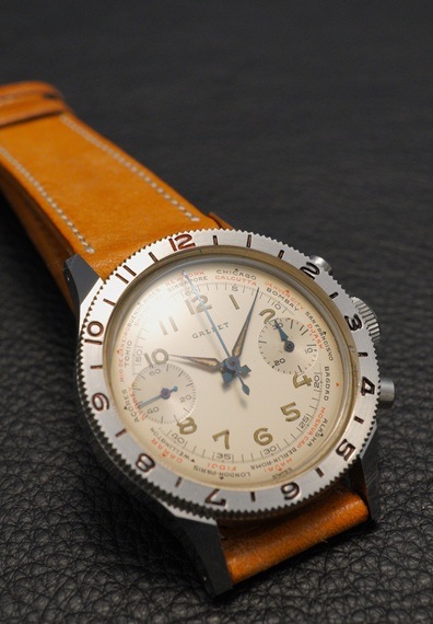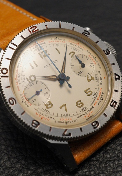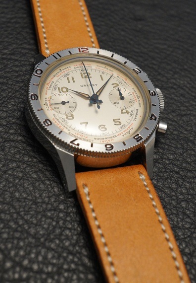 特徴的な形状のシャープな夜光長短針と、エッジの効いたラグが魅力的な一本です。シンプルなデザインのツーカウンタークロノですが、ミニッツマーカーの外周に表記され各国名やシャープな夜光針等のこのモデルならではのディテールはしっかりと見て取れます。スッキリとしたデザインにアイボリー調になったエイジングとも相まって、よりフライングオフィサーの美しさが映えるデザインと言えるでしょう。ケースにはラグ部分に擦れキズは見受けられますがポリッシュ感は無く、本来のエッジの効いたケースデザインをそのままお楽しみいただけます。また、特徴的な回転ベゼルもインク抜けはほとんど見られず、稼働もスムーズです。回転ベゼルに緻密なダイヤル、そして重厚感漂うクラムシェルケースと、ヴィンテージならではの意匠を楽しむことのできるギャレット、フライングオフィサー。ぜひこの機会にご検討ください。