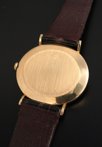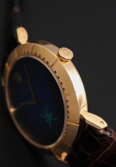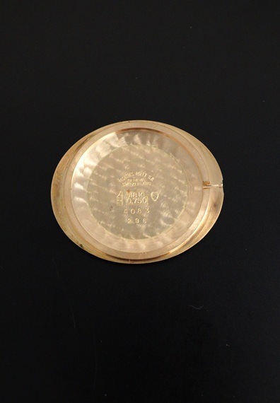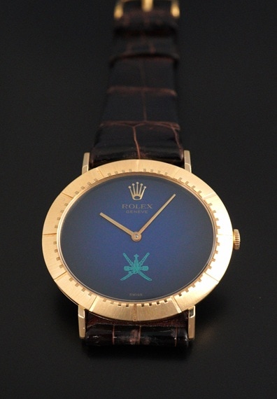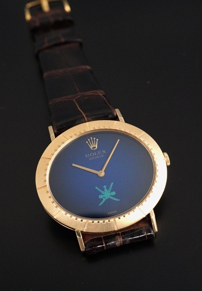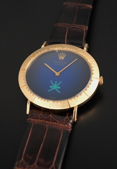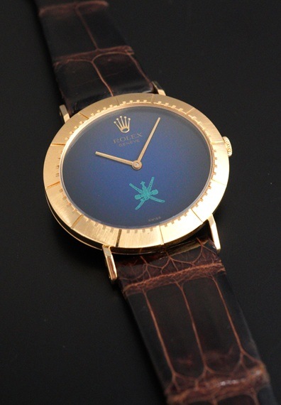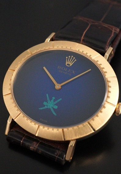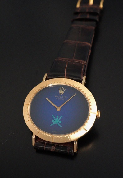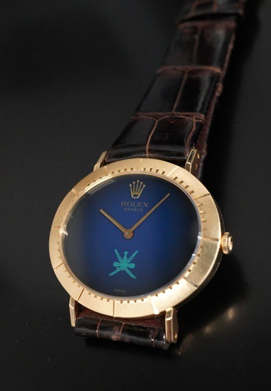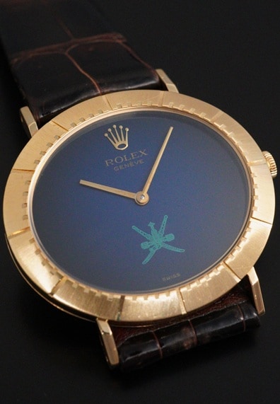 今回の個体は希少なオマーン国章がダイヤル印字されたモデルです。6時位置に伝統的な武器である短剣カンジャル(ハンジャール)に2本の太刀を組み合わせたロゴで、同国の首長の支配と威厳を象徴しています。ややグラデーションがかかったブルーダイヤルとも相まって、チェリーニならではのシンプルな2針モデルに唯一無二な印象を与えてくれます。シンプルで端正なデザインが魅力のチェリーニですが、インデックスが刻まれた横オーバル型の18KYGケースや特徴的なダイヤルデザインから、同モデルならではの雰囲気はありながらも、全く異なるモデルとも見て取れるでしょう。ダイヤルの希少性に目が向きがちですが各所のコンディションも大変良好で、ダイヤルの大きな経年変化やポリッシュされた形跡は見受けられません。ラグ部分や各所のエッジ感も販売当時の状態を維持しており、ケースサイドのホールマークもしっかりと見て取れます。薄型手巻きムーブメントであるCal.1600もオーバーホール前ながら良好な状態です。