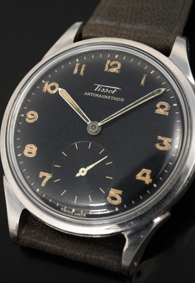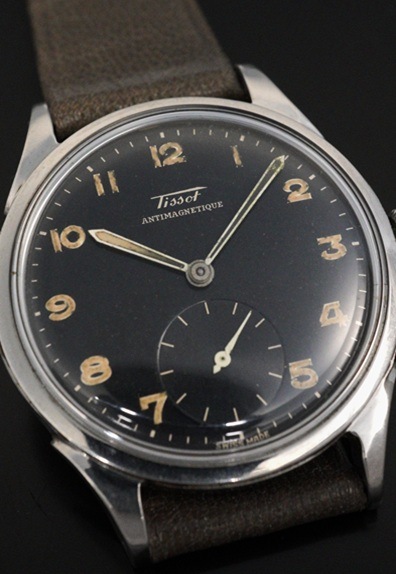 ややマットな質感のブラックダイヤルにヴィンテージらしい枯れ感が魅力の夜光インデックス&夜光針が映えるミリタリーライクな一本となります。長短針の夜光については一部欠損が見られますが、むしろ一点物という点を際立たせています。35mmのビッグケースに加えて、ボリューミーなスクリューバック仕様のケースも腕にのせると独特の存在感を放ちます。ミリタリーライクなダイヤルと相まって素晴らしい雰囲気です。搭載するCal.27-1Tも目立った傷や汚れのない美しい状態をキープしています。様々なダイヤル、ケースバリエーションが存在する人気のティソ。定番のモデルとはなりますが、デザインや雰囲気が良い個体は日に日に少なくなってきています。 ぜひこの機会にご検討ください。