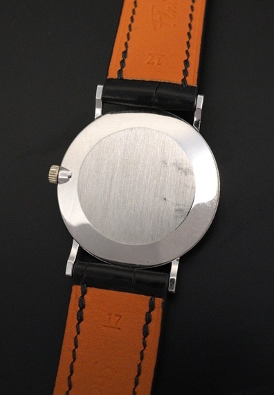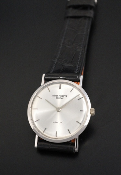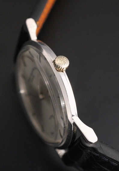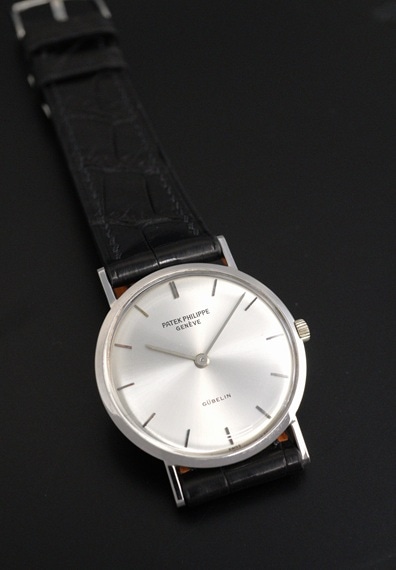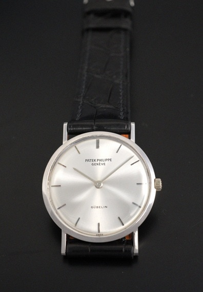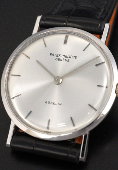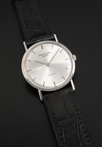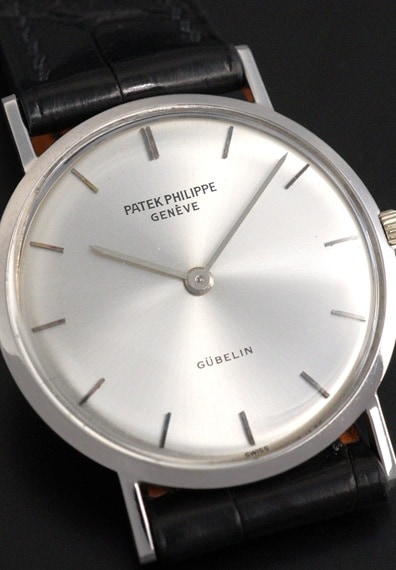 ケース径が29mmと小ぶりで上品な佇まいが魅力的なモデルです。薄型の2針というドレスタイプの王道のデザインと上品な18KWGケースは、軽やかに着用することのできる普段使いに適したヴィンテージパテックです。ラグを含めたケースコンディションも良好で、シンプルながら凛としたWGケースを楽しむことが出来ます。バーハンド×バーインデックスにサンバースト仕上げと、端正なダイヤルもダメージ等見られない綺麗な状態をキープしています。6時位置に入る「GUBELIN/ギュブラン」も良いアクセントとなっており、ケースとダイヤルともに、このモデルのデザインをしっかりご堪能いただけるでしょう。