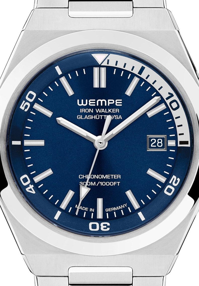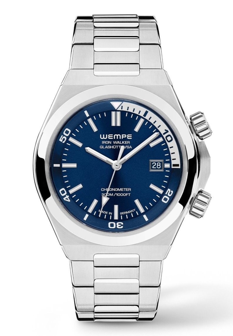 センターセコンド、日付表示、回転式インナーベゼルを備えたアイアンウォーカー オートマティック ダイバーズウォッチは、ダイバーズウォッチの厳格なISOおよびDIN規格の基準をすべてクリアしています。直径42mm、厚さ11.70mmのステンレススチール製ケースは30気圧防水を備え、ブルーの文字盤が特徴です。スーパールミノバコーティングされた針とインデックスは、暗闇でも優れた視認性を確保します。