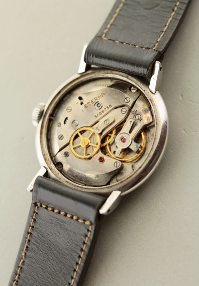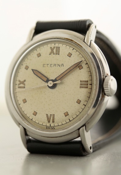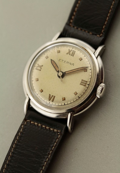 夜光のローマン&スクエアドットインデックスというデザイン性の高いダイヤルに、アンティークらしいエイジングが加わった雰囲気抜群の一本です。特徴的なラグ、ケースもこの味のあるダイヤルを一層際立たせています。通好みのエテルナならではのテイストと言えるでしょう。31ミリという小振りなケースサイズでありながら、スクリューバック仕様というのも見逃せません。