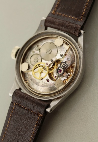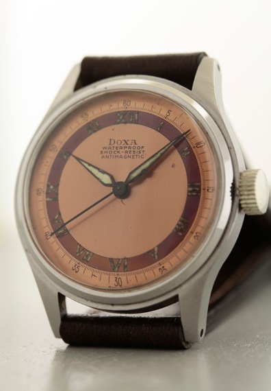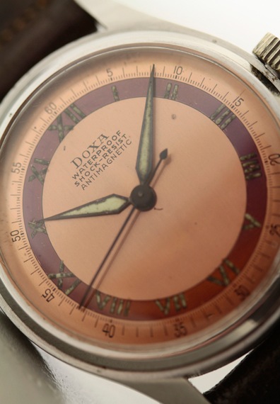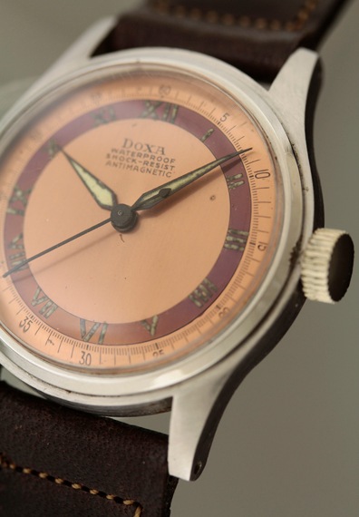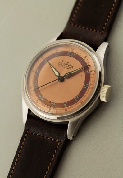 カッパ―系のツートンダイヤルモデルで、インデックスが配された赤紫色のサークルは独特の経年変化が起こっており、光のあたる角度でグラデーション状の美しい輝きを放ちます。