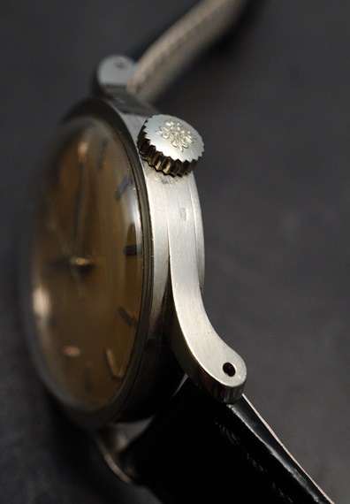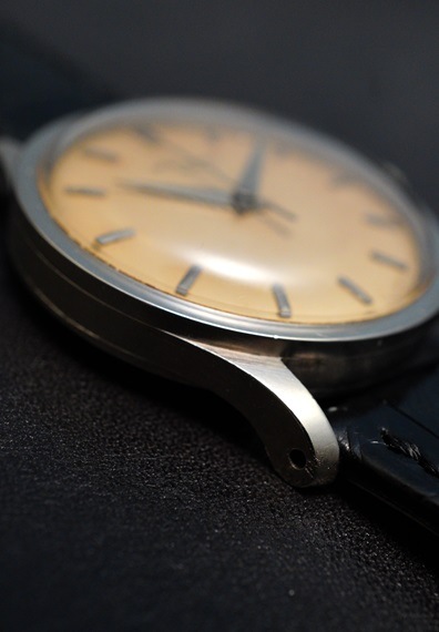 素晴らしいダイヤルの経年変化に目が向きがちですが、本来のディテールもしっかりと感じていただけます。ケースには若干の小キズ、使用感は見られるものの、ダイヤルのエナメルロゴの立体感はしっかりと見て取れます、同モデルならではの均整ながら迫力のあるデザインと、力強く手の込んだつくりのインデックス、ドルフィンハンド、秒針も健在です。本来のディテールとヴィンテージらしい魅力的なエイジングが合わさり、デザインと全体的なバランスの良さをさらに引き立てています。