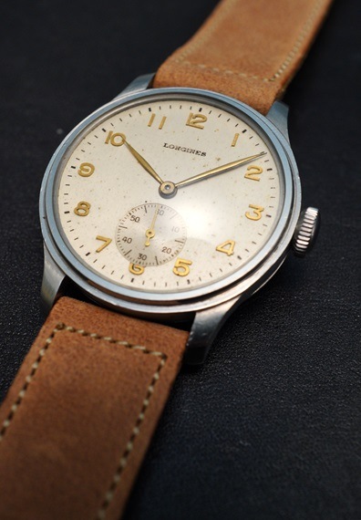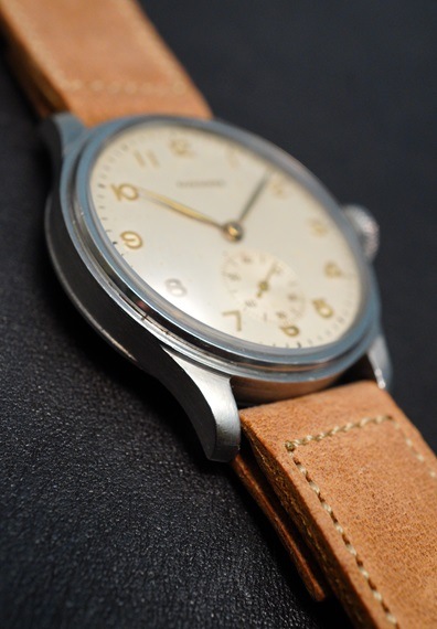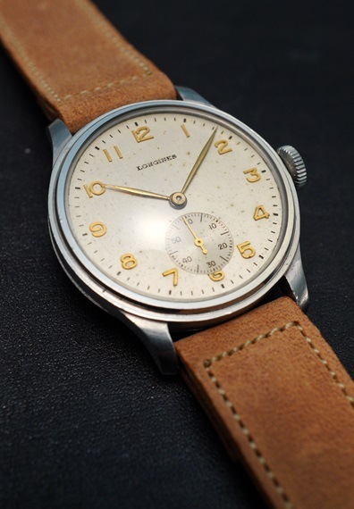1942年製のロンジンのトレタケ、三つ爪スクリューバックケースモデルが入荷しました。バリエーション豊かなケースサイズ、ダイヤルデザインが魅力的な同モデルですが、今回はエンボスのアラビアインデックスにシャープなリーフハンドが映える一本です。インデックスと各針は金色で統一されており、どこかアイボリー調に見受けられるダイヤルに良いアクセントとなっております。