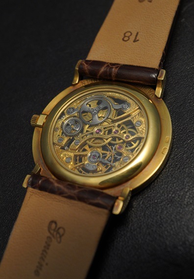 今回のモデルはベースは薄型で2針のドレスウォッチスタイルですが、ダイヤルと裏蓋がスケルトン仕様の「フルスケルトン」となっています。単なるスケルトン化だけに留まらず、ムーブメンのCal.1003/1には随所にエングレービングが施されています。外周部分は同色でサテン仕上げが施され、インデックスは彫り込み込みのデザインとなっています。細かい造形のダイヤルとは対照的に端正な仕上げになっている為、ツートンダイヤルのようにも思えます。こうした繊細な仕上げの違いでそれぞれの印象を変え、ダイヤルに凝縮感を与えている作り込みは同ブランドならではと言えるでしょう。外周部分にはやや経年変化が見られますが、ムーブメントは非常に美しい状態を維持しています。