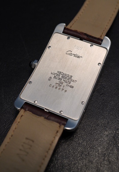 カルティエが誇るタンクウォッチらしい直線的なレクタンギュラーフォルムに、アイコニックなローマンインデックスと青焼きのバトン針、サファイアカボションリューズなど、カルティエの伝統的な要素が見事に取り入れられています。ケースサイズだけ聞くと、46×26mmのサイズ感はやや大ぶりに感じられるかもしれませんが、実際に腕に乗せると美しい曲線を描く縦長のケースが腕にしっかりと沿ってくれる為に、装着感は抜群です。