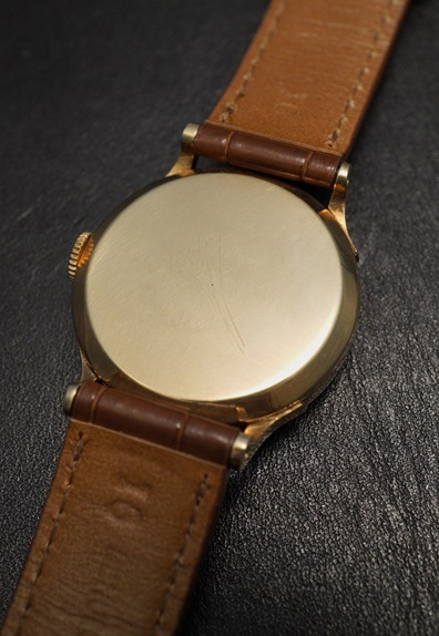 30㎜の絶妙なサイズ感のカラトラバスタイルのケースとエンボスによる全アラビア数字のインデックス、そして繊細ながら立体感のあるリーフハンドがバランスよく組み合わされた一本です。ダイヤルには若干の経年変化が見られますが、全体の雰囲気を壊すようなマイナスのイメージではなく、ヴィンテージらしい枯れ感としてご納得いただけるレベルかと思われます。ケースも本来のシェイプが残ったなかなかの状態で、14KYGの柔らかな色合いもダイヤルとマッチしておりとても魅力的です。