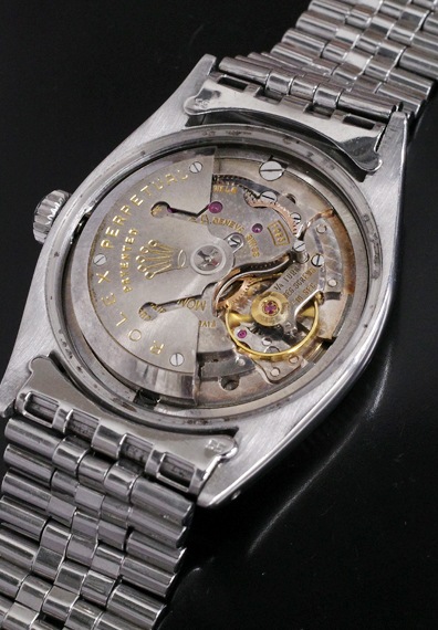 ダイヤルはシャンパンゴールドのようにわずかに赤みを帯びた素晴らしい雰囲気で、着用時の肌合いも抜群です。力強いドルフィンハンドや赤黒カレンダーなど、この年代ならではの魅力的なディテールもしっかりと残っており、ボリューミーなオイスターケースも大きなダメージは見受けられません。搭載するのはバタフライローター仕様のCal.1065。こちらの状態も良好です。