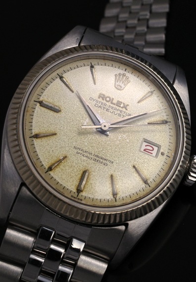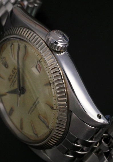 刻みの細やかなWG製のフルーテッドベゼルと、エンボス仕上げのROLEXロゴ&砲弾型インデックスという人気の組み合わせとなります。