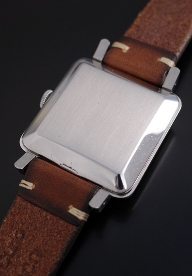 生命線となるケースも大きなダメージ等は見られず、緩やかにカーブした特徴的な風防も残っています。ラグを含まないと32×32ミリという決して大きなサイズではありませんが、着用するとその存在感は圧巻で、ボンベ状のダイヤルとベゼル、風防が描く流麗なシルエットが非常にクラシカルで魅力的です。