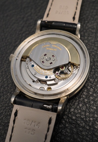 Ref.5281と言えば、内側に抉る様な造形のケースサイドが特徴的な一本です。加えて今回の個体は、ケースが18Kホワイトゴールドのモデル。金無垢ならではの「ズシッ」と感じる重厚感…ステンレススティールの仕様とはひと味違う柔らかな色味も、この時計の良さをより一層引き立てています。また、中央に向かって盛り上がったボンベ状のダイヤルもケースの重厚感を際立たせ、サイドからのシルエットをより印象的なものにしています。バーインデックス&バトンハンドという視認性の良いシンプルなデザインとのマッチングも素晴らしく、まさにオーデマらしいデザインセンスが光ります。ダイヤルにはやや経年変化が見受けられますが、着用時には大きく気にならないでしょう。