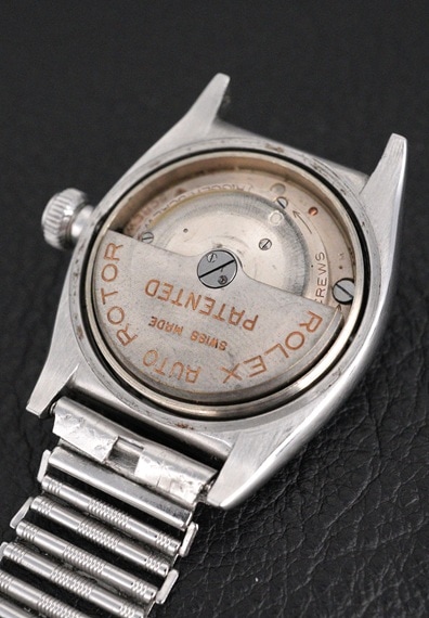 全体的に年代相応の経年変化は見受けられますが、ダイヤルは枯れ感とデザインが上手くマッチしており、良い味わいのある雰囲気と言えるでしょう。オリジナルであるビッグサイズの+(プラス)リューズも残っており、バブルバックならではの意匠をまだまだ楽しんでいただけると思います。搭載するムーブメントは、バブルバックではお馴染みのCal.NA。ローターの傾斜がほとんど無く、フラットな形状は初期のモデルならではのディテールです。古き良き時代のデザイン性の高いヴィンテージロレックス、バブルバック。希少なアーリーモデルです。ぜひこの機会にご検討ください。