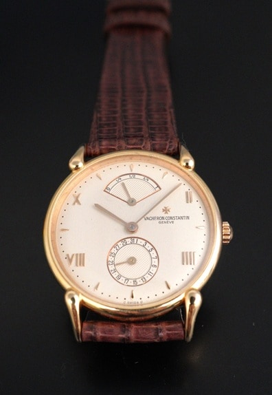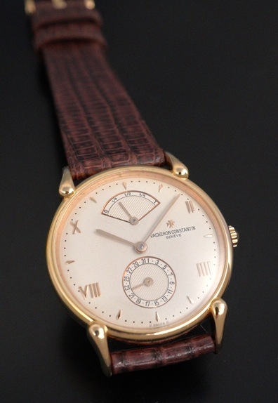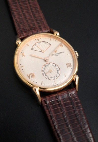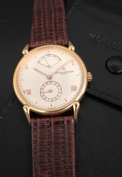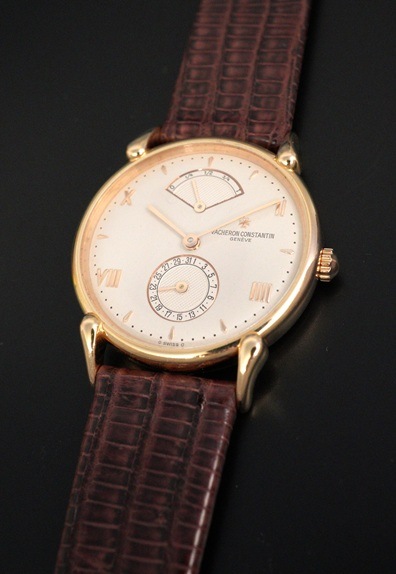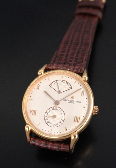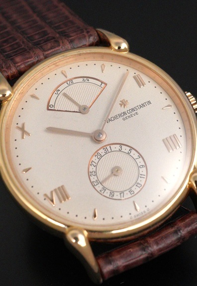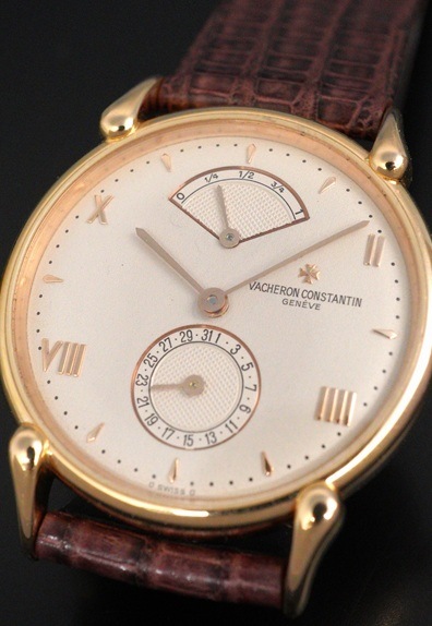 今回の個体も、90年代のモデルならではのサイズ感と古典的なディテールも随所に見られるモデルです。12時位置に扇状のパワーリザーブ表示や6時位置のディスクカレンダーは、内周はギョーシェ模様となっており、アンティークにも通ずるようなメリハリの効いたデザインが魅力的です。インデックスのアプライドによるローマ数字&クサビ型の組み合わせや、程よくアイボリー調に焼けたダイヤルカラーとも相まって、近年モデルながらもオールドヴァシュロンのような独創的なスタイルを存分にお楽しみいただけます。