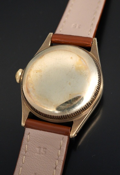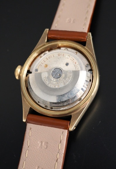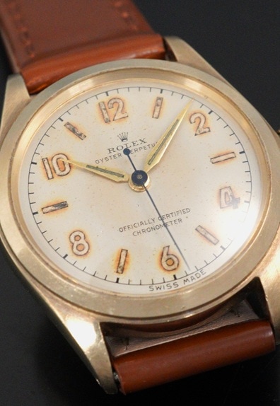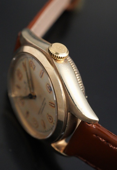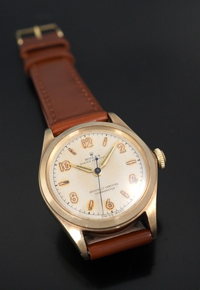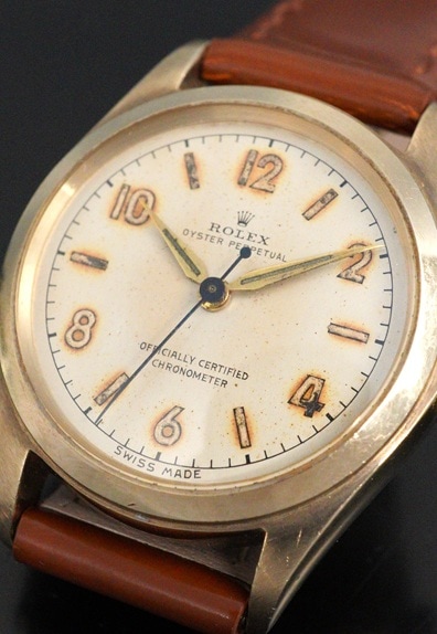 一見すると30~40年代によく見られる手巻きモデルのオイスターではありますが、こちらはケースサイズ29mmのボーイズサイズのバブルバックです。Cal.ARを搭載したモデルは、一般的なCal.NAを搭載したバブルバックよりも遭遇率は遥かに低く、その希少性とこのサイズならではの凝縮感がバブルバックならではの魅力と言えます。夜光の偶数飛びアラビア数字&バーインデックスにシャープなアルファハンドは、この年代のロレックスらしい組み合わせです。全体的に若干の経年変化が起こっていますが、肉眼ではさほど目立たず、エイジングとしてヴィンテージらしい味わい深い風合いと言えるのではないでしょうか。また、各夜光についても後年の塗り直しは長短針のみで、インデックスはラジウム夜光の名残が残ります。褐色がかった色味がダイヤルやケースにマッチして、素晴らしい雰囲気です。ケースも使用による傷は勿論ありますが、小ぶりながらもバブルバックが持つふくよかなケースシェイプはしっかりと感じられます。渋い色味の9KYGケースとの相性は秀逸です。希少なCal.AR搭載のバブルバック。他モデルとは一線を画すヴィンテージロレックスと言えるでしょう。ぜひこの機会にご検討ください。