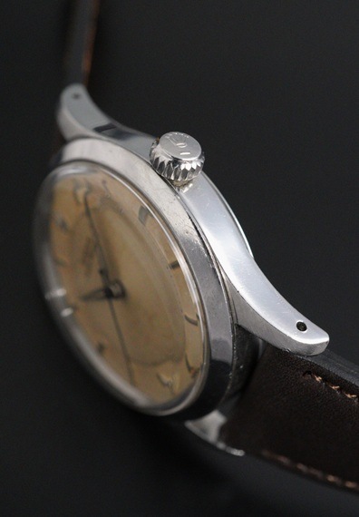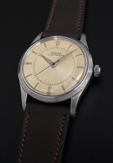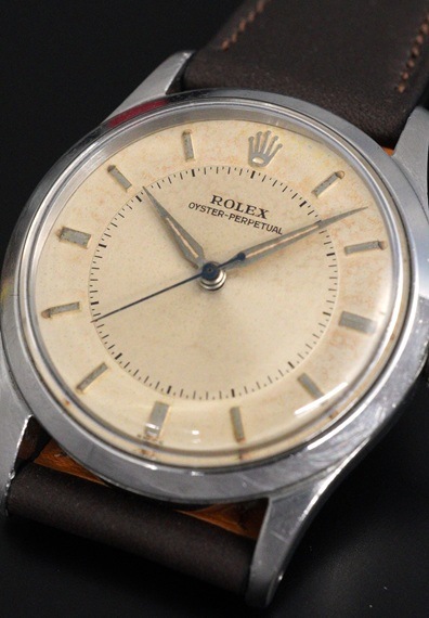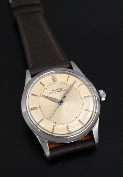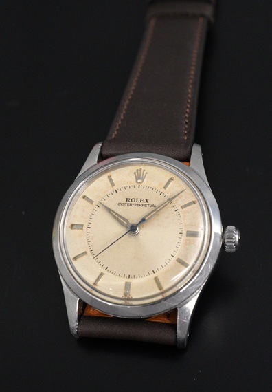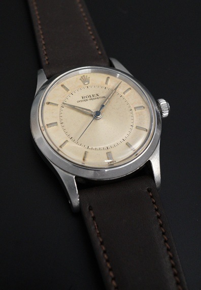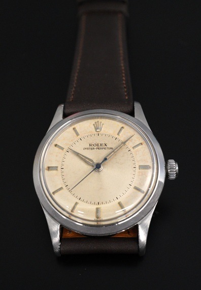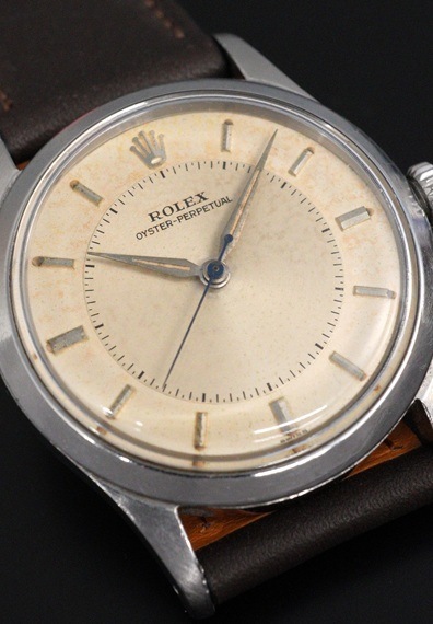 1950年代製のロレックス、Ref.6532が入荷いたしました。 ノンデイトで自動巻きCal.1030を搭載したモデルとして様々なダイヤルバリエーションが存在するRef.6532。今回入荷したのは、美しくエイジングしたダイヤルが魅力の雰囲気のある一本となります。ダイヤルは全体的に枯れ感のあるアイボリーカラーにエイジングしており、均一にエイジングした様子は異なる仕上げのツートンダイヤルをより一層引き立てています。着用すると非常に肌合いも良く、経年変化も含めてひとつのデザインと思えるような素晴らしいテイストです。 ケースも33㎜と程よく、ノンデイトという点も含めて着用場面を選ばない良いサイズ感です。小傷等は見られますが、ダイヤルの雰囲気とはマッチしている為に大きくは気にならないでしょう。オイスターケースならではのふくよかなシェイプは健在で、着用時のシルエットも魅力のひとつです。 スタンダードモデルではありますが、このテイストで探すとなると話は別です。他モデルは一線を画すようなエイジングで、抜群の存在感を誇るRef.6532。雰囲気のあるヴィンテージロレックスの選択肢としてお勧めしたい一本です。是非この機会にご検討ください